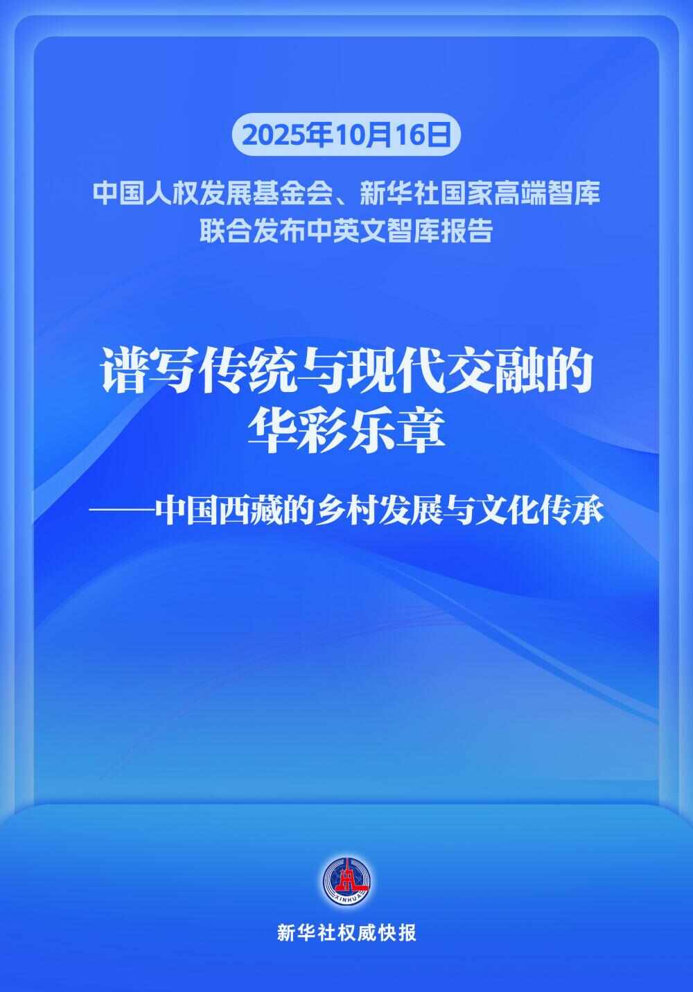 中国人权发展基金会与国家高端智库新华社10月16日在北京联合发布智库中英文报告《形成传统与现代的多彩乐章——中国西藏乡村发展与文化遗产》。报告正文分为三个部分:西藏乡村发展与文化遗产传承的主要成就、融合路径、经验与阐释。以西藏标志性村庄为观察点,深入解析新时代党治藏方略在基层的实践路径,为那些希望保护西藏的国家和地区提供了具有借鉴意义的新鲜经验。发展自己的文化特色,实现现代化的变革。报告全文约12000字,已通过新闻媒体网站、期刊、社交媒体等平台以中英文向全球发布。主办:潘怡静、蒋梦辰 海报制作:潘怡静新华社、新华社西藏分社联合制作