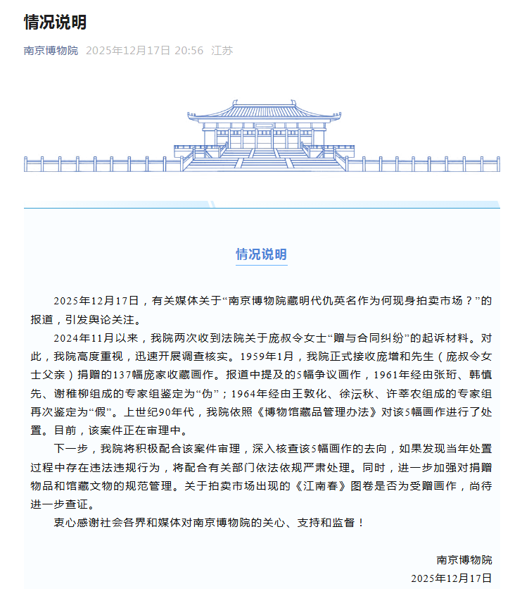 12月17日,南京博物院发布《情况声明》,具体内容如下: 情况声明 2025年12月17日,相关媒体报道《南京博物院藏明代仇英作品为何出现在拍卖市场?》引起了公众的关注。自2024年11月以来,我院已两次收到法院就庞淑玲女士“捐赠合同纠纷”提起的起诉材料。我院对此高度重视,迅速开展调查核实。 1959年1月,我院工作人员收到庞增和先生(庞淑玲女士的父亲)捐赠的庞氏家族藏画137幅。五个争议l 报告中引用的画作于1961年被张衡、韩慎贤、谢稚柳组成的专家组鉴定为“赝品”; 1964年,王敦华、徐云秋、徐信农组成的专家组再次进行了此项研究。 20世纪90年代,我院按照《博物馆藏品管理办法》处置了这5幅画作。目前,该案正在审理中。下一步,我院将积极配合案件审理,深入调查五幅画的下落。处置过程中如发现违法行为,我们将会同有关部门依法依规严肃处理。此外,我们还将进一步加强捐赠物品和馆藏文物的规范管理。拍卖市场上出现的《江南春》长卷是否为捐赠画作,还有待进一步核实。我因衷心感谢社会各界和媒体对南京博物院的关心、支持和管理!南京博物院此前于2025年12月17日报道:庞来臣(1864-1949)是中国近代伟大的收藏家。其所藏《虚斋》历代名画以品质精湛、体系完整而闻名。素有“江南藏甲天下,徐斋藏甲江南”之称。 20世纪50年代,庞来臣后人向南京博物院等多家文化机构和国有博物馆捐赠了大量重要的古代书画。其中,捐赠数量最多的是南京博物院,共137件(套)。一些古老的古迹成为这些机构的瑰宝。然而,令人惊讶的是,庞来臣后人向南京博物院捐赠的一幅明代仇英《江南春》卷轴却突然出现。今年出现在北京的一场艺术品拍卖会上,估价8800万元。经庞来臣曾孙庞书令举报以及国家文物部门介入后,拍卖公司取消了拍卖。庞来臣后人向南京博物院捐赠的明代仇英《江南春》长卷(部分)于2025年出现在北京一家拍卖公司的预展中。庞书岭在向南京博物院提起诉讼前不久,质疑捐赠的名画是否流自南京拍卖市场,并要求艺术品在南京博物馆拍卖。南京归还了仇英《江南春》长卷等向南京博物院捐赠“丢失”的古画。 2025年12月16日,庞书岭签署《强制执行申请书》,正式向法院申请强制南京博物院提供《江南春图》等古画流转明细。庞氏捐赠的明代仇英卷。材料。来源 |南京博物院及澎湃新闻此前报道